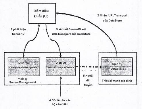 Thiết bị IoTManagementandControi có thể kết nối để truyền tải các thiết bị trong mạng UPnP. Điều này bao gồm các thiết bị đưa ra dịch vụ lưu trữ dữ liệu [4] cũng như các thiết bị truyền tải UPnP khác nhằm chấp nhận dữ liệu cảm biến. Hình 2 minh họa dòng kết nối với thiết bị IoTManagementandControl với dịch vụ lưu trữ dữ liệu bên ngoài. Dòng này có thể được mô tả như sau: